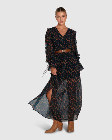 Dainty ruffles add texture to the Come As You Are Floral Maxi Dress, made with soft chiffon, a half-lined skirt and an unlined sleeve for a sheer, romantic feel. Also featuring adjustable ties for the waist and cuffs.